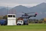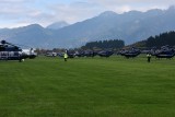 Für die Durchführung des Lehrgangs musste das Segefluggelände in Füssen vorübergehend mit notwendigen Extras ausgestattet werden. Dazu zählte ein mobiler Tower mit Sendemast für das kontrollierte Befliegen des Bereiches der Einflugschneise. In kleinen Gruppen von vier oder fünf Maschinen, mit wenigen Sekunden Abstand, füllt sich schnell das Gelände. Kaum am Boden werden die Hubschrauber neu betankt. Mit zwei Tanklastwägen wird dies zügig und mit viel Routine abgewickelt. Dieser sensible Vorgang des Tankens sichert ein Fahrzeug der Bundespolizei-Feuerwehr ab.